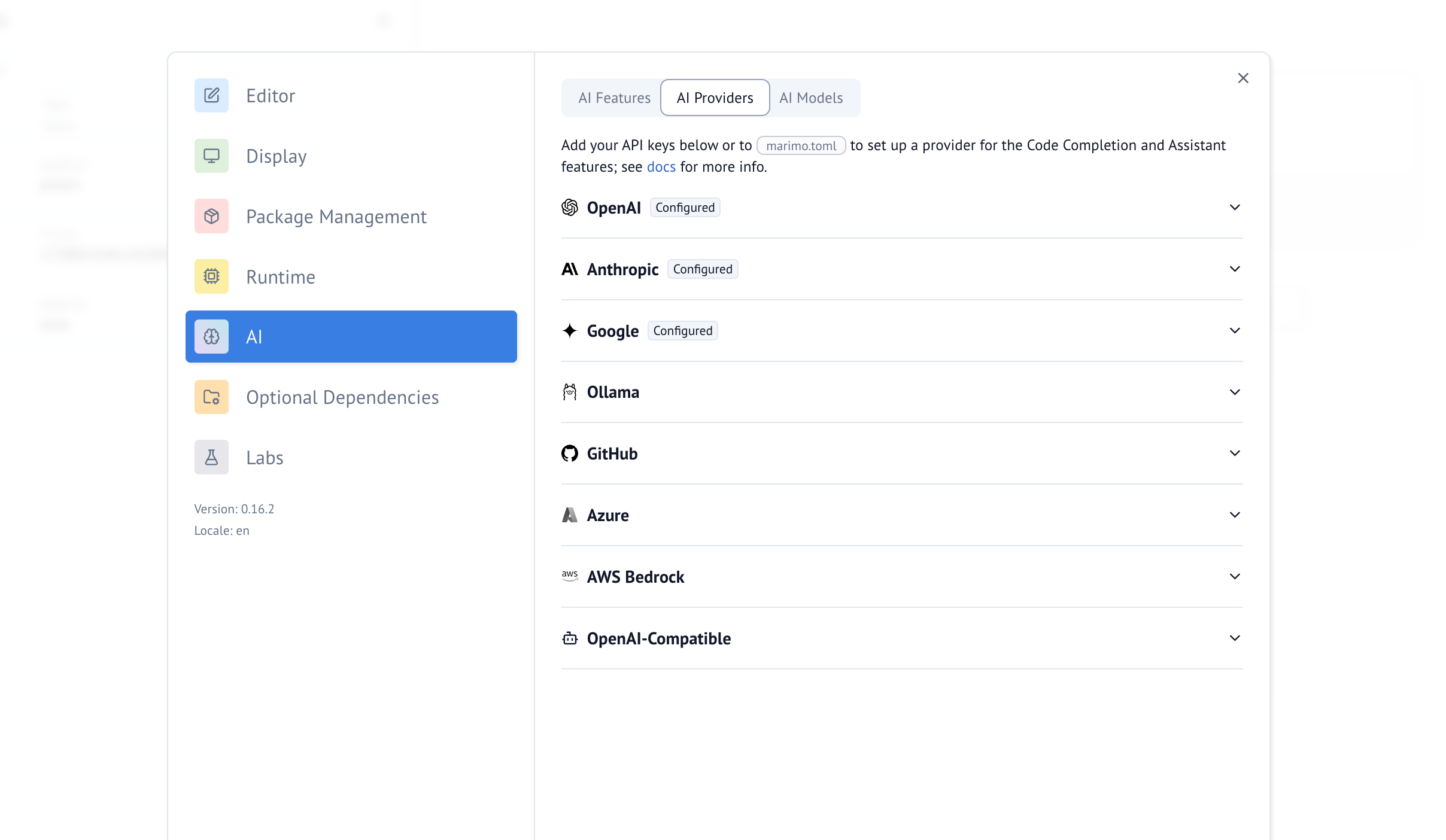 Connect marimo to an LLM via the notebook Settings panel (recommended) or by editing marimo.toml directly. Prefer going through the notebook settings menu to avoid errors with the config file.
